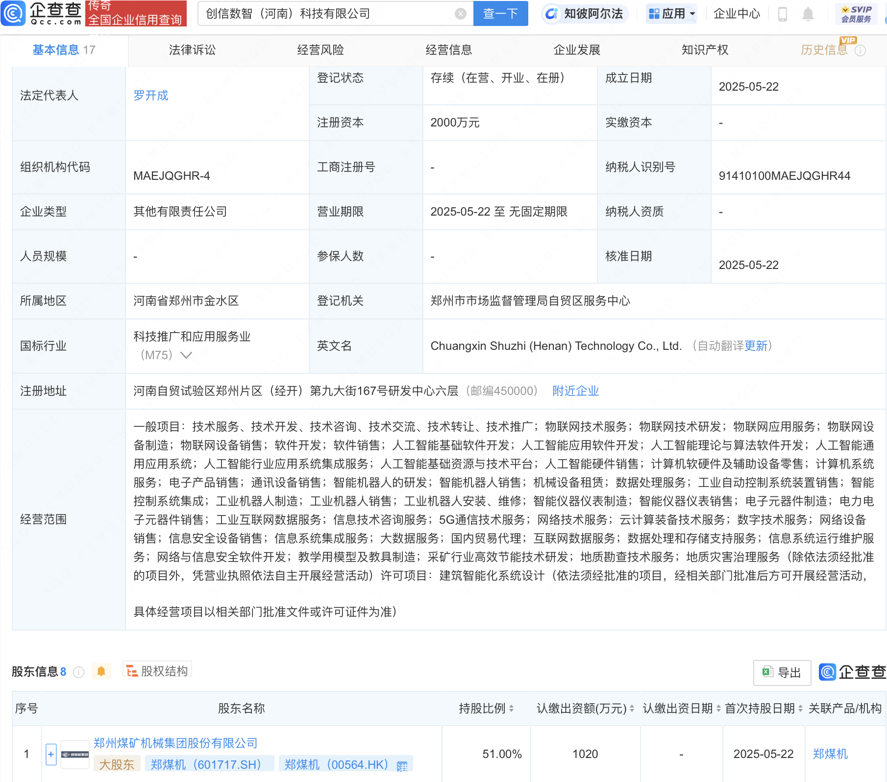 企查查APP显示,近日,创信数智(河南)科技有限公司成立,法定代表人为罗开成,注册资本2000万元,经营范围包含:人工智能基础软件开发;人工智能应用软件开发;人工智能理论与算法软件开发;人工智能通用应用系统等。企查查股权穿透显示,该公司由郑煤机(601717)等共同持股。