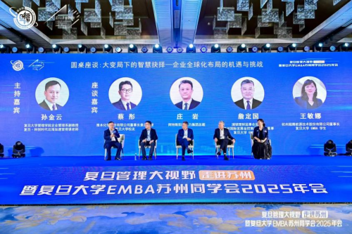 圆桌对话环节,孙金云副教授与雅本化学股份有限公司董事长兼总经理、复旦大学校友蔡彤,阿特斯阳光电力集团股份有限公司总裁庄岩,浦银理财监事会监事长、苏州国际发展金控集团董事会董事、复旦大学EMBA校友詹定国,杭州超腾能源技术股份有限公司董事长、复旦大学EMBA学生王敏娜,围绕“大变局下的智慧抉择—企业全球化布局的机遇与挑战”话题展开深入对话。
