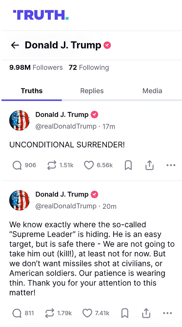 “我们确切地知道所谓的‘最高领袖’藏身何处,”特朗普补充道,“他很容易被击中,但在那里很安全——我们不会把他干掉(杀死!),至少目前不会。但我们不希望导弹袭击平民或美国士兵。我们的耐心正在耗尽。”