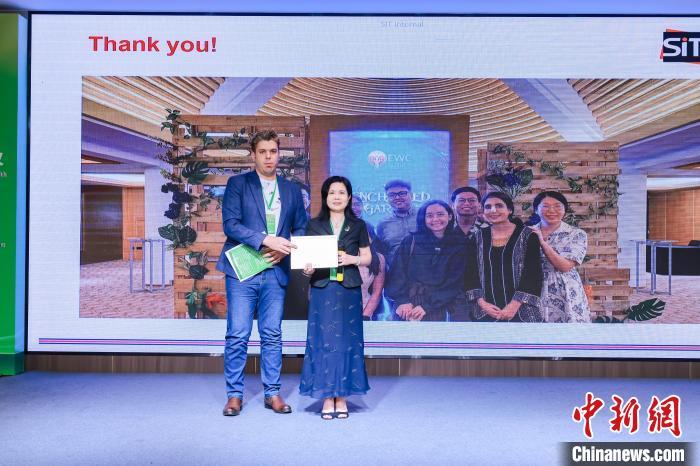 图为福州大学生物科学与工程学院院长汪少芸教授为参会外籍学者颁发演讲证书。福州大学供图