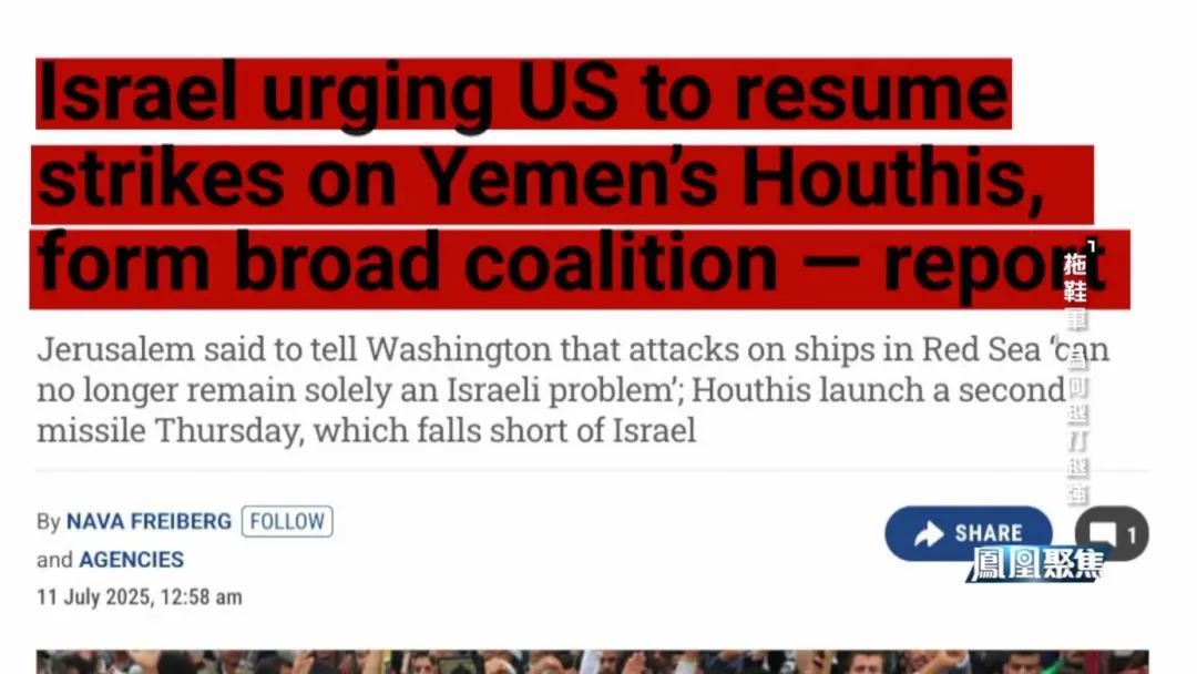 以色列媒体事后爆料称,胡塞武装在红海上袭击商船之际,以色列正催促美国对胡塞武装目标发动猛烈空袭。以色列呼吁美国“组建一个多国共同针对胡塞武装行动的联盟”。