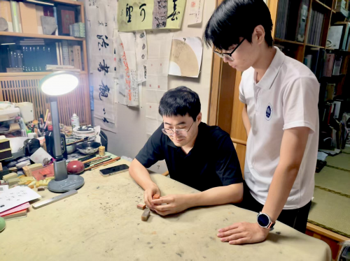 在西湖边的西泠印社,实践团采访了资深社员金恩楠,探讨金石篆刻在当代的传承路径。“我们首先要打好自己的根基,传承好这门古老的艺术。”金恩楠,其次要用年轻人所喜欢的方式传播出去,让篆刻‘活’起来。”