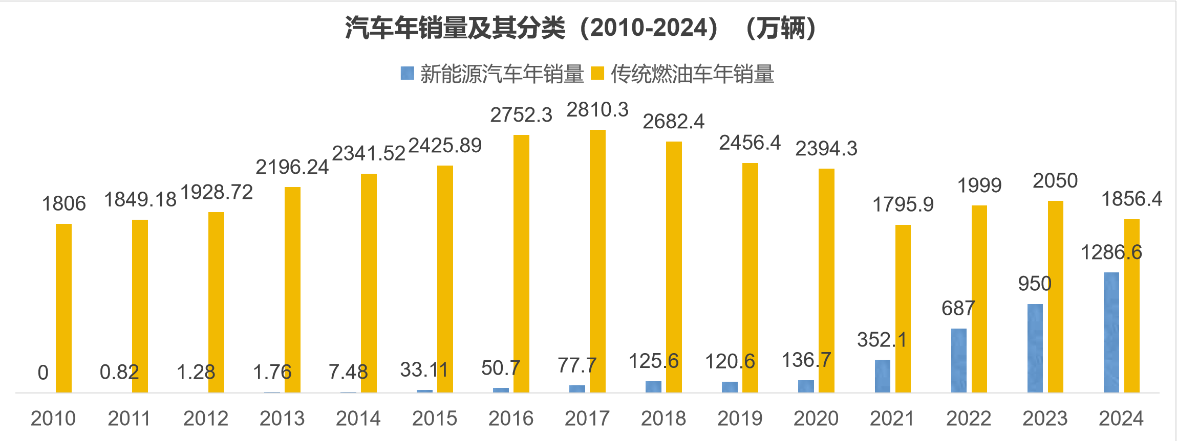 2010-2024年新能源汽车年销量与传统燃油车年销量统计图