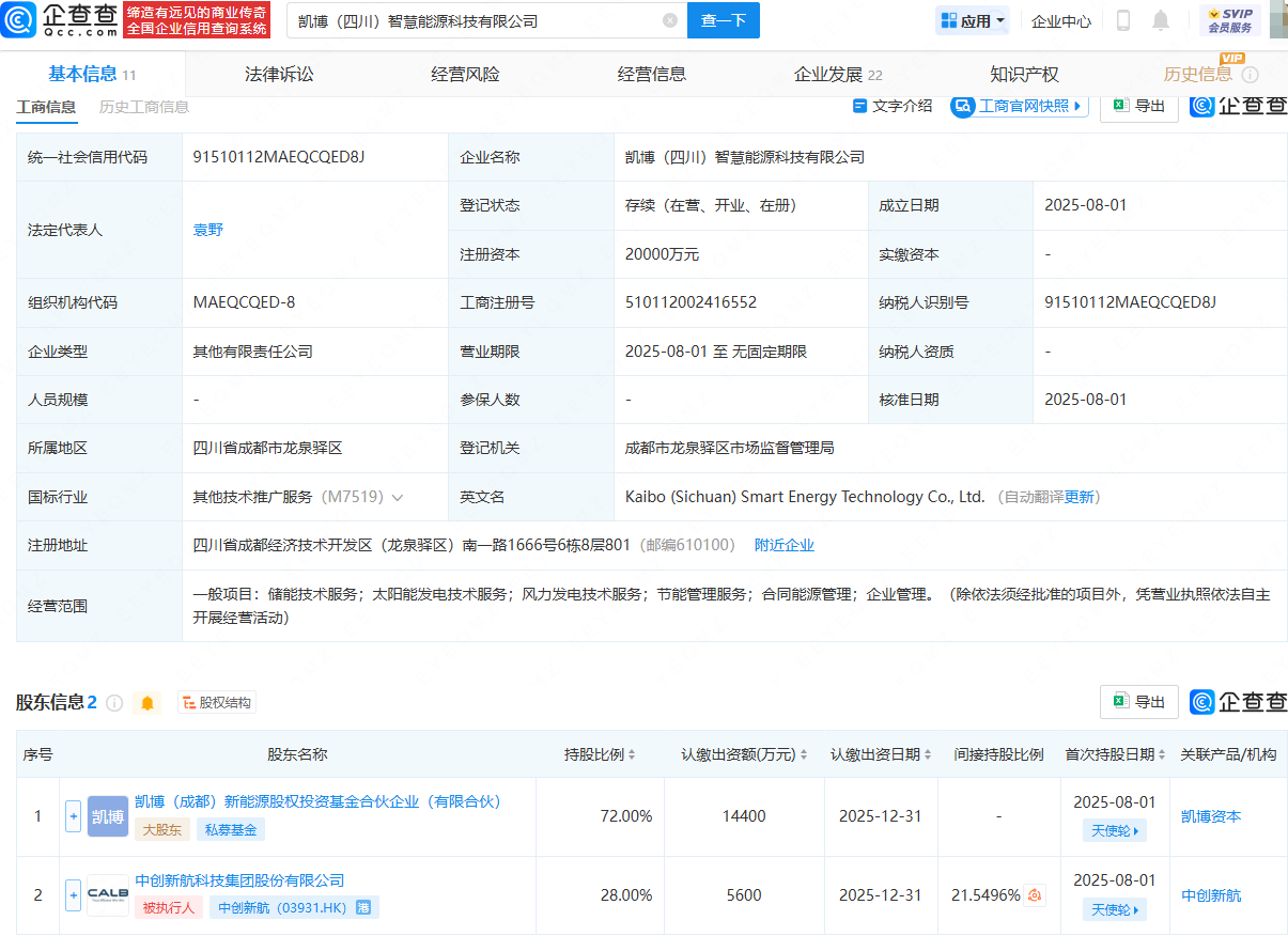 企查查APP显示,近日,凯博(四川)智慧能源科技有限公司成立,法定代表人为袁野,注册资本为2亿元,经营范围包含:储能技术服务;太阳能发电技术服务;风力发电技术服务;节能管理服务;合同能源管理;企业管理。企查查股权穿透显示,该公司由中创新航(03931.HK)、凯博(成都)新能源股权投资基金合伙企业(有限合伙)共同持股。