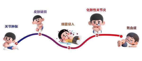 甚至若慢性关节炎导致的皮肤破损和免疫功能紊乱,导致病原微生物侵入血液循环并生长繁殖,产生大量毒素和代谢产物引起严重毒血症症状,这将开启继发感染“死亡通道”: