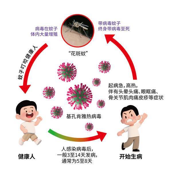 4、面临的现实威胁:“花斑蚊”(白天活跃,偏好干净积水产卵)叮咬感染病毒的人后,病毒在蚊体内复制,数天后进入唾液腺,再次叮咬健康人时完成传播。与登革热的传播途径高度相似,虽然目前尚无直接人传人的报道,但各年龄段人群均可能被叮咬而感染发病,导致全国大范围的扩散。