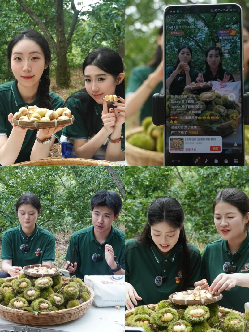 随后,队员们轮番上阵,各展所长。有的手持板栗讲解品种特性:“咱们这个板栗生吃脆甜多汁,像水果一样清爽,煮熟后粉糯香甜,不管是炖汤、糖炒还是做菜,都是绝佳食材”;有的现场演示剥板栗技巧,一边操作一边用清晰的语言讲解步骤;还有的邀请当地农户出镜,在队员的引导下,用朴实的方言搭配普通话,讲述板栗种植的辛劳与收获的喜悦。直播间里“怎么购买”“产地直发吗”的提问不断刷屏,订单量随着讲解的深入持续攀升。