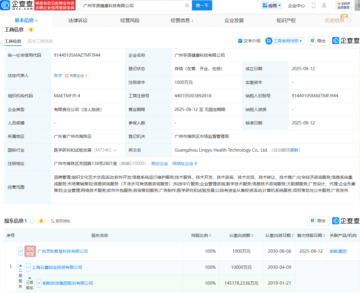 企查查APP显示,近日,广州苓语健康科技有限公司成立,法定代表人为张宇,注册资本1000万人民币,经营范围含品牌管理、组织文化艺术交流活动、软件开发、信息系统运行维护服务、社会经济咨询服务、信息系统集成服务、市场营销策划、信息咨询服务等。企查查股权穿透显示,该公司由蚂蚁集团旗下广州灵知智慧科技有限公司全资持股。