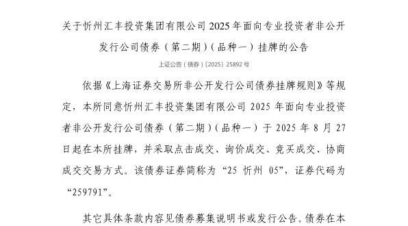 8月26日,上交所发布关于忻州汇丰投资集团有限公司2025年面向专业投资者非公开发行公司债券(第二期)(品种一)挂牌的公告。