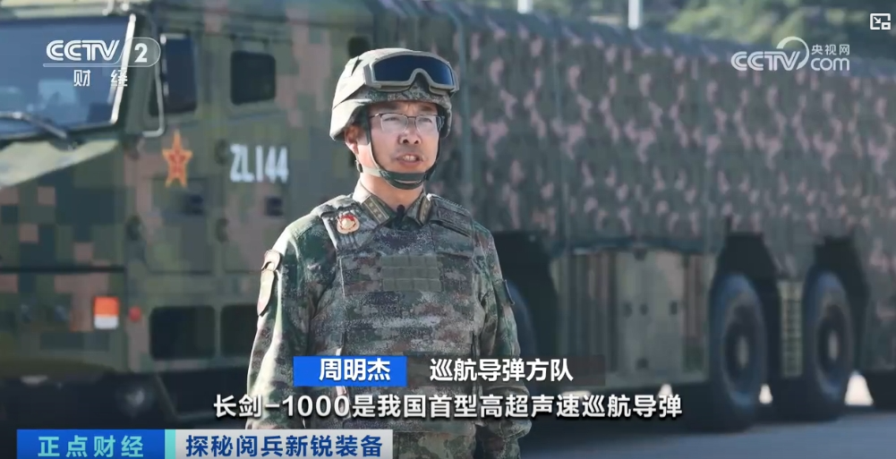 其中,长剑-1000导弹是火箭军新型高超声速巡航导弹。阅兵结束后,央视《探秘阅兵新锐装备》栏目采访巡航导弹方队周明杰。他介绍,长剑-1000是中国首型高超声速巡航导弹。