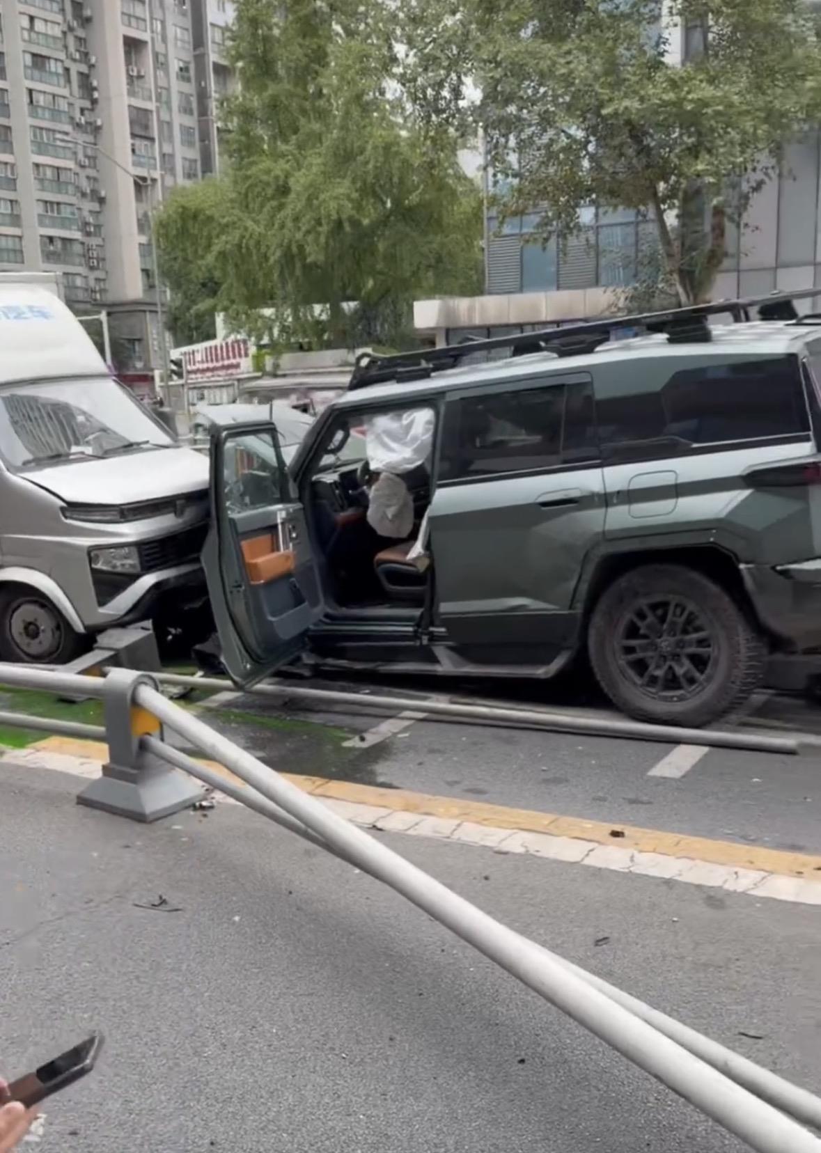 监控视频显示,一辆越野车高速撞向了道路中间护栏。现场群众拍摄的事故发生后的视频显示,这辆越野车撞击了多辆汽车,有人员受伤,其中一辆出租车受损严重,涉事越野车车头也损毁严重。