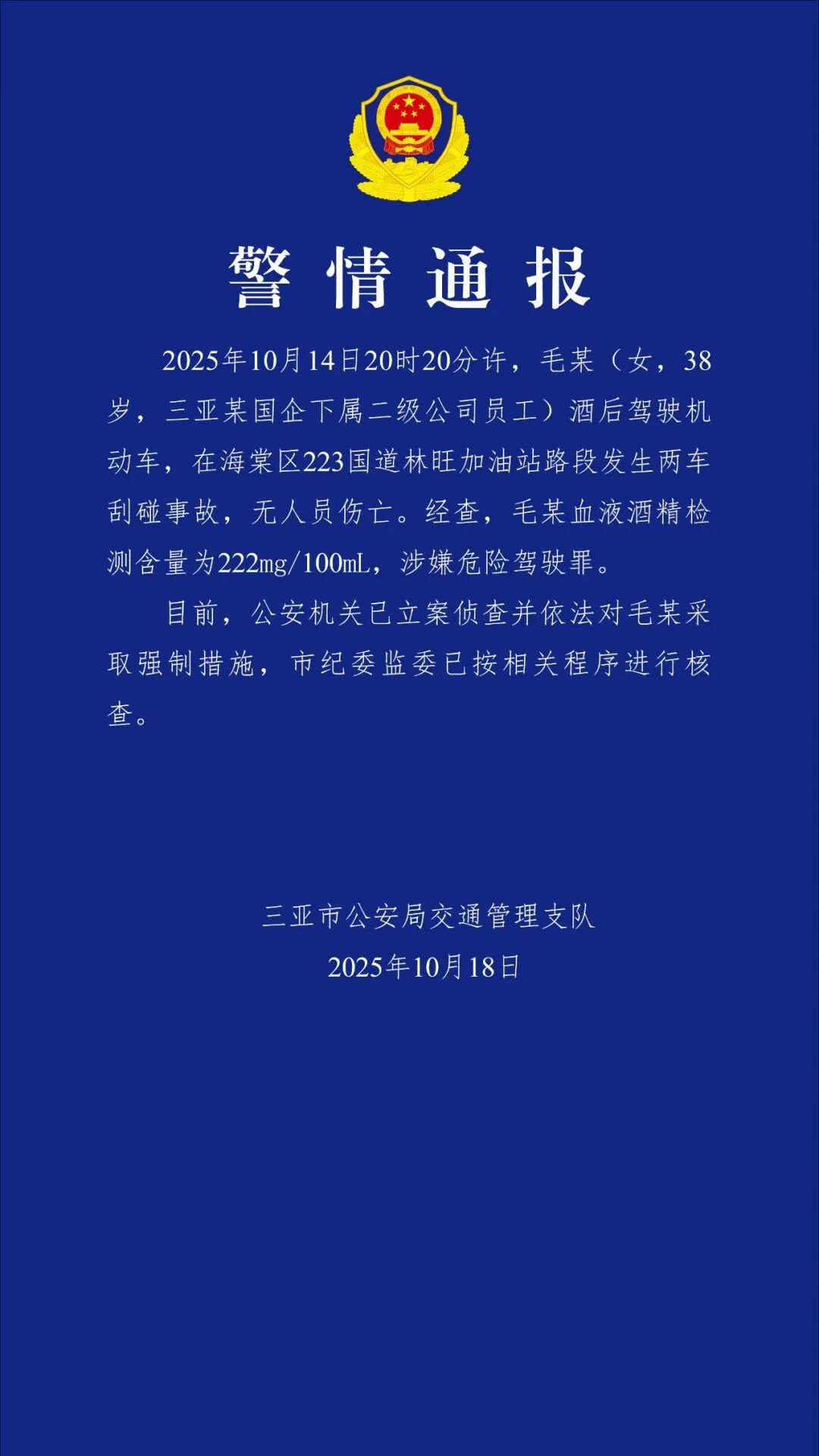 10月14日,海南三亚一女子酒后倒车撞到一辆劳斯莱斯,随后情绪激动地自称国企员工,扬言让市委市政府通报自己的违法行为。