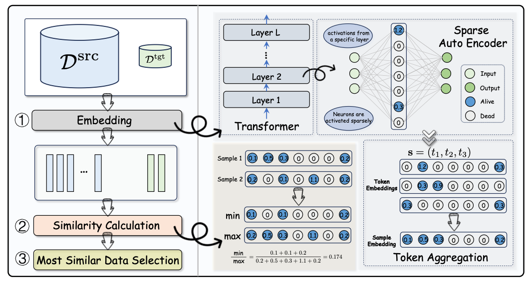 以模型内部神经元激活而非仅文本语义来表征样本,并通过稀疏自编码器将多义激活解耦为可解释的“单义”特征,在稀疏空间完成任务对齐与相似度度量,实现更稳健的数据精选,为企业级指令微调与垂直应用提供“少而精”的数据基座。
