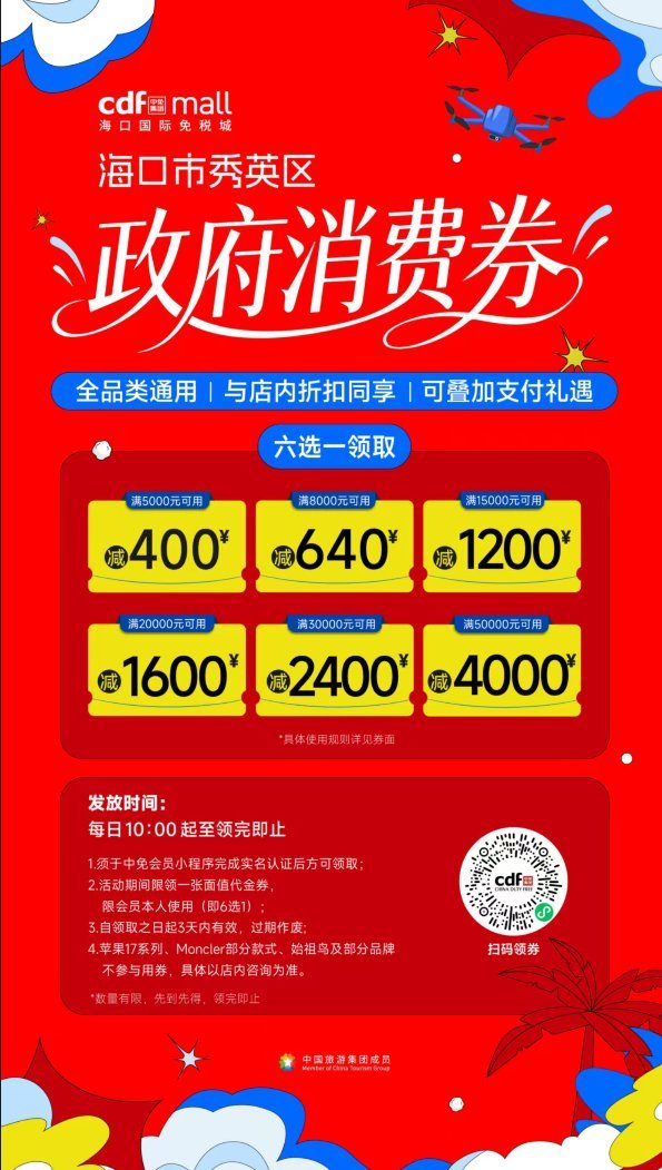 据介绍,海口市秀英区商务局将发放cdf海口国际免税城新一轮消费券,定好闹钟,准时领券: