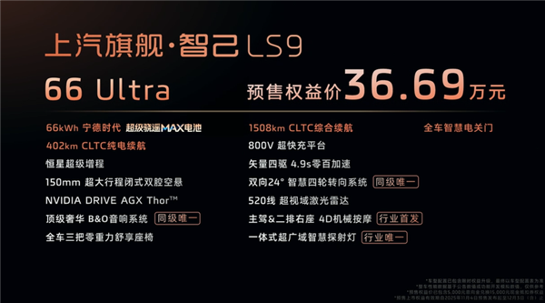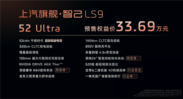 此外,智己汽车还透露了LS9的Hyper版本信息,该版本将升级线控转向及高性能三电机系统,零百加速将进入3秒级别,预计在明年初推向市场。