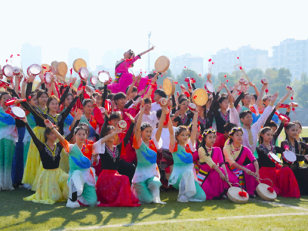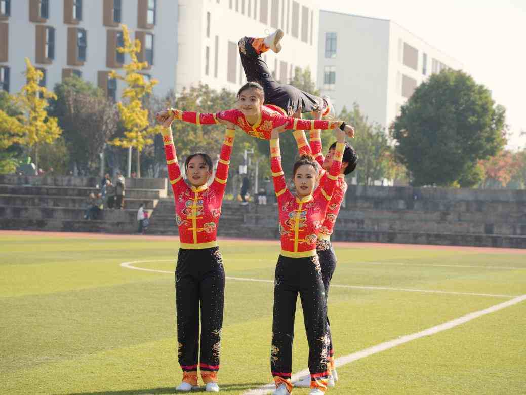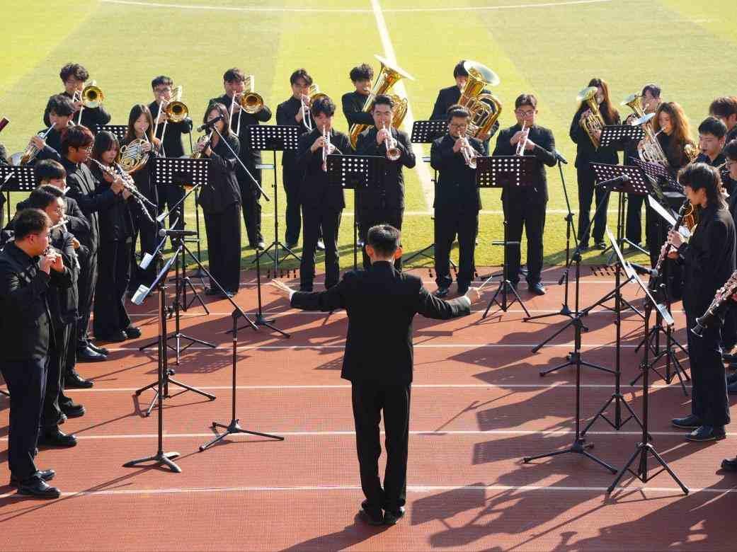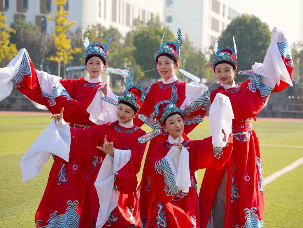 开幕式表演精彩纷呈。交响管乐《钢铁洪流进行曲》气势磅礴,奏响了体育竞技的激情乐章;舞蹈《鼓舞江淮》灵动奔放,展现了安艺学子的青春风采;黄梅戏《女驸马》选段韵味悠长,彰显了安徽地方戏曲的独特魅力;民族健身操节奏明快、活力四射,洋溢着蓬勃朝气;歌舞《最美的太阳》温暖励志,为运动健儿注入奋进力量。