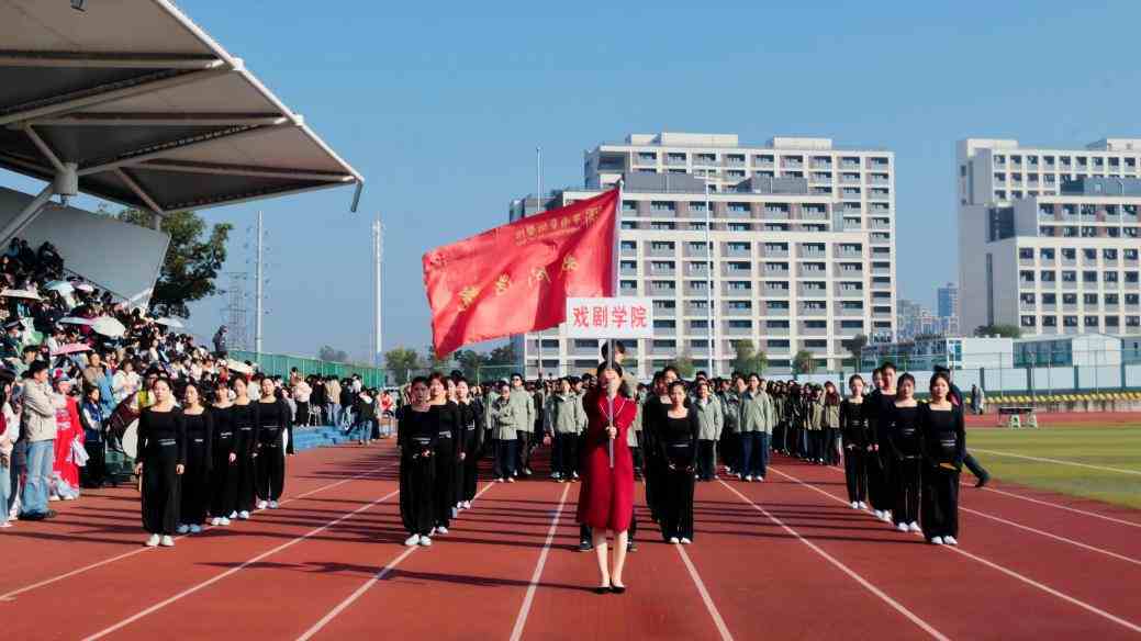 伴随着响彻全场的《运动员进行曲》,国旗方阵、裁判员方阵和运动员方阵依次上场。他们意气风发,身姿挺拔,口号响亮,步伐铿锵有力,充分展现了安艺师生奋发向上的精神风貌,完美诠释了艺术与体育相融合的昂扬风采。