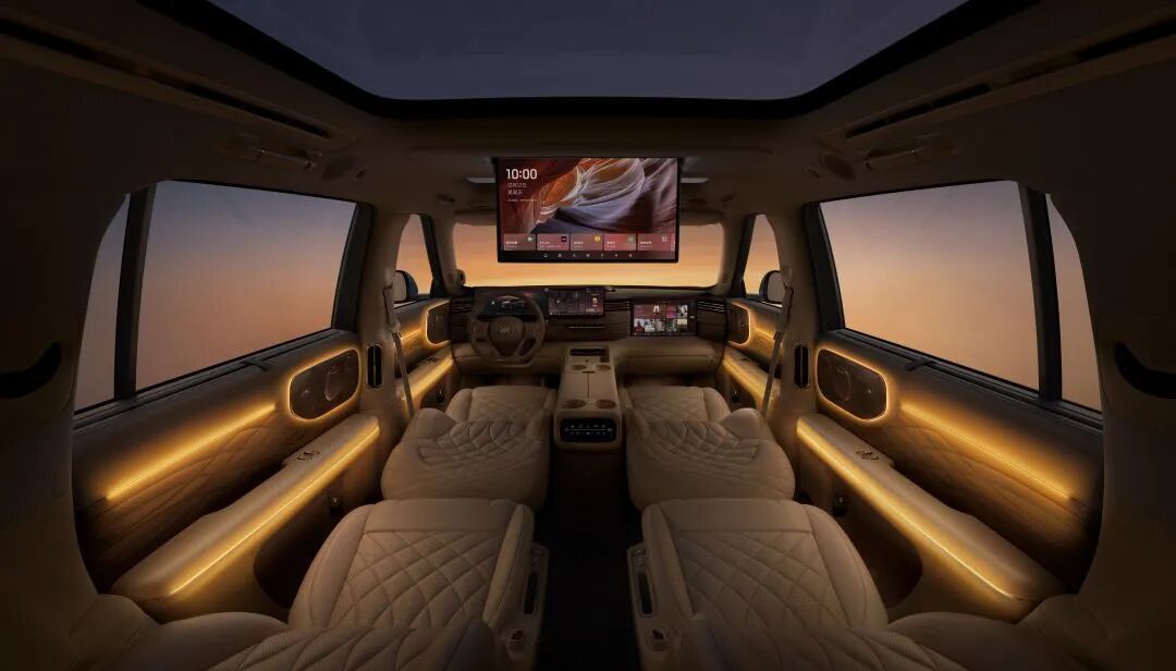 座椅配置上,全球首发的4D机械按摩座椅以7倍于气动按摩的力度,精准复刻专业按摩师手法,长途出行也能缓解疲劳。全车标配三排“零重力座椅”,支持多向电动调节与腿托延伸,让每位乘客都能找到舒适放松的坐姿。