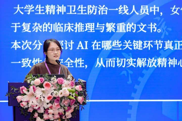 北京交通大学医院临床心理科主任、北京市海淀区高校心理健康服务联盟指导专家谢兴伟医师和大家分享了“让 AI 替我们省力、避坑:解放精神心理专业女性的生产力”的主旨报告。她结合自身参与大学生精神防治工作的经验,介绍了AI在心理健康领域的应用探索,并指出AI应在该领域进一步发展情感捕捉能力。