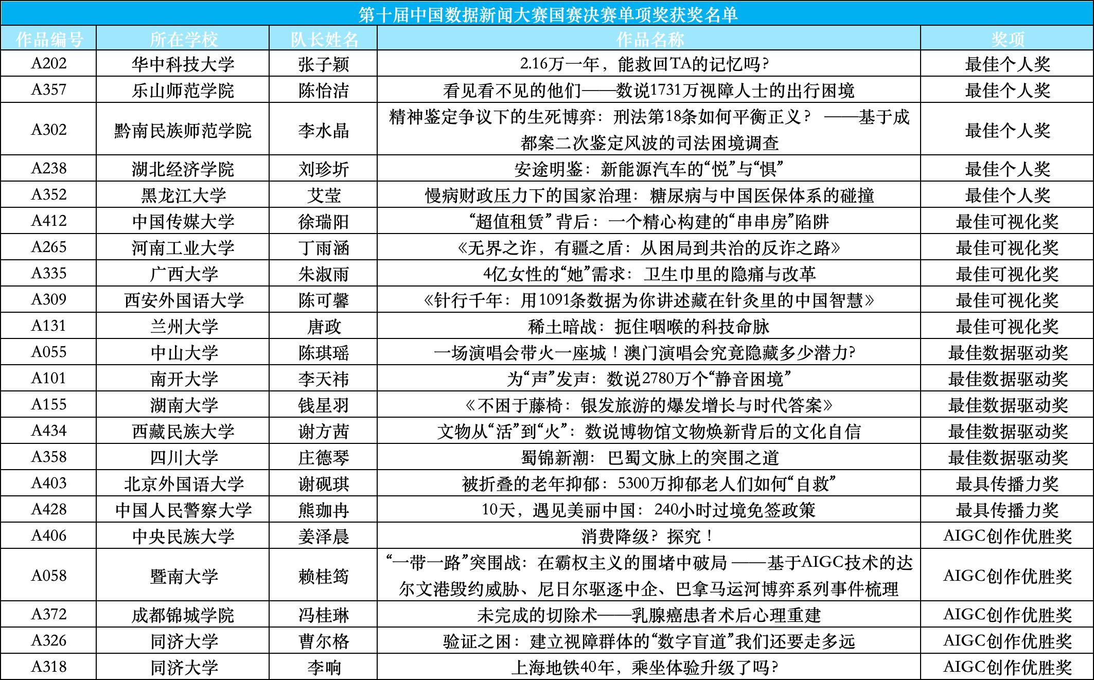 第十届中国数据新闻大赛暨首届AIGC应用大赛由北师港浸会大学、西安交通大学新闻与新媒体学院、武汉体育学院新闻传播学院主办,北师港浸会大学承办,香港浸会大学传理学院、中央民族大学新闻与传播学院、湖南大学新闻与传播学院、兰州大学新闻与传播学院、吉林大学新闻与传播学院、山东大学新闻传播学院、安徽大学新闻传播学院、河南工业大学新闻与传播学院、西南大学新闻与传媒学院、广西大学新闻与传播学院、南京师范大学新闻与传播学院、宁夏大学新闻传播学院、新疆大学新闻与传播学院、大连外国语大学新闻与传播学院、河北经贸大学新闻与文化传播学院、成都大学文学与新闻传播学院、江西师范大学新闻与传播学院、内蒙古师范大学新闻传播学院、山西大学新闻学院、海南师范大学新闻传播与影视学院、黑龙江大学新闻传播学院、西藏民族大学新闻传播学院、福建师范大学传播学院、天津工业大学人文学院、山东师范大学新闻与传媒学院、云南民族大学文学与传媒学院、湖南女子学院文学与传播学院、河北传媒学院新闻传播学院、成都大学斯特灵学院、湖北经济学院新闻与传播学院、合肥大学语言文化与传媒学院、黄冈师范学院传媒与影视学院、郑州经贸学院法律与传媒学院、河南省高校影视教育协会、群众新闻网、萌泰数据联合主办,央广网陕西频道、陕西日报传媒集团、陕西广电融媒体集团(台)、西安交通大学出版社、城市经济导报、暨南大学融合新闻课程群虚拟教研室、黄冈师范学院传媒与艺术国家级实验教学示范中心、陕西交融智慧信息科技有限公司、上海萌泰数据科技股份有限公司、八爪鱼大数据、点点数据、湖北日报传媒集团、中国网湖北站、中国科学报湖北站、江西省天轴通讯有限公司协办,获得了《新闻与传播研究》《国际新闻界》《新闻大学》《西安交通大学学报(社会科学版)》《新闻记者》《编辑之友》《中国编辑》《福建师范大学学报(哲学社会科学版)》《武汉体育学院学报》《中国新闻传播研究》《新媒体与社会》JOURNAL OF BROADCASTING & ELECTRONIC MEDIA等学术期刊的支持,以及新华社陕西分社、新华社湖北分社、人民日报社湖北分社、中央广播电视总台湖北总站、新华网、人民网、央广网陕西频道、光明日报、科技日报、经济日报、中国新闻出版广电报、湖北日报、湖北广播电视台、长江日报、中国科学报陕西站、中国科学报湖北站、中国教育报、陕西日报传媒集团、陕西广电融媒体集团(台)、三秦都市报、群众新闻网、西部网、陕西网、中国网湖北站、西安报业传媒集团、西安广播电视台、城市经济导报社、澎湃新闻政务中心、华商网、凤凰网陕西频道、新浪陕西、腾讯大秦网、起点新闻网等50余家媒体的关注。