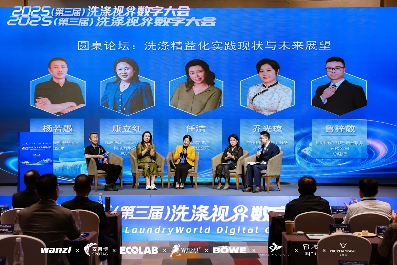 “圆桌思辨”环节,鑫源医纺(三河)洗涤科技有限公司总经理康立红、广州市杏林卫生服务有限责任公司董事长乔光琼、上海纯纯洗涤有限责任公司CEO任洁、彩家政洗涤服务中心总经理杨若愚四位嘉宾在四川匠心智洗清洁服务有限公司鲁梓敬的主持下,围绕洗涤精益化实践的痛点与破局展开深度对话,分享了数据驱动决策、标准化体系搭建等破局路径。