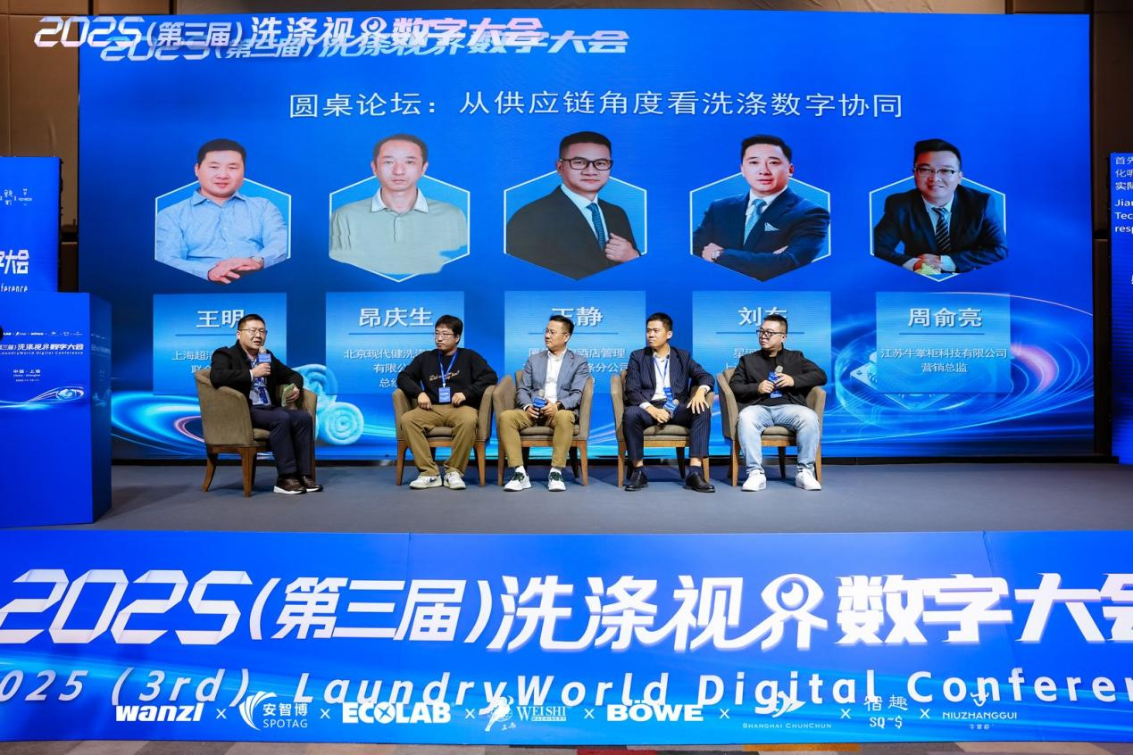 最后的“圆桌对话”环节,北京现代健洗涤服务有限责任公司总经理昂京凯、上海星河湾酒店区域房务总监许海峰、厦门航空酒店管理有限公司洗涤分公司总经理王静、江苏牛掌柜科技有限公司营销总监周俞亮四位嘉宾在上海超洁&北京蓝天联合创始人王明的主持下,共探供应链数字协同新路径,一致认为行业协同需基于共同目标的生态共建。