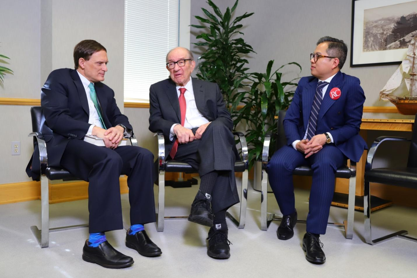 笔者Wayne Lai黎永达(右)与前美联储主席 格林斯潘(中)及商品专家Jeffrey Christian(左)交流合照。