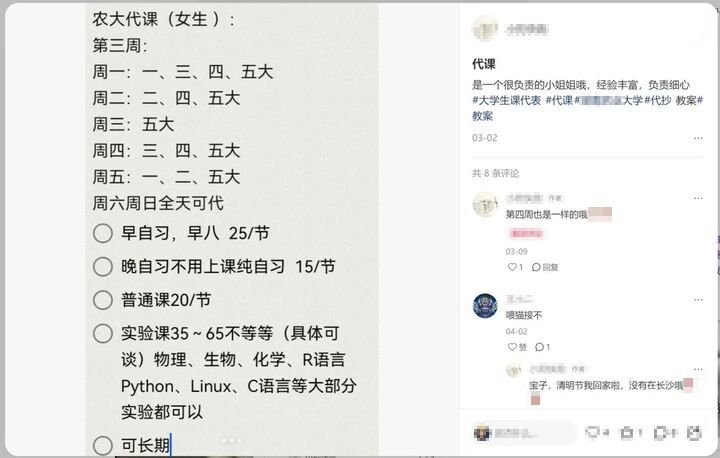 谈及“市场行情”,钩钩非常熟悉。“早自习最累,早上8点1节课25元,其他时间的普通课程20元1节。专业门槛高的实验课,价格能涨到35元至65元不等。”她特别强调,给研究生有偿替课是香饽饽,“不仅报酬高,还因为研究生忙于科研而没空上课,更容易发展成长期客户”。钩钩回忆,曾有一位非全日制研究生因在外工作,连续让她替一学期的小班公共课,不仅每月支付固定报酬,还额外给不少“小费”。
