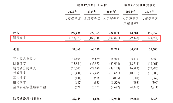 而工业机器人行业高研发投入的特性以及公司现阶段的销售成本管理,让公司的盈利能力与现金流稳定性均面临考验。2022至2024年三个完整年度,公司销售成本分别为1.431亿元、1.621亿元、1.628亿元;2024年上半年和2025年上半年,销售成本则分别为0.794亿元、1.054亿元。从成本占比来看,上述各时间段销售成本占同期收入的比例依次为 72.5%、72.9%、69.6%、69.4% 和 67.6%。