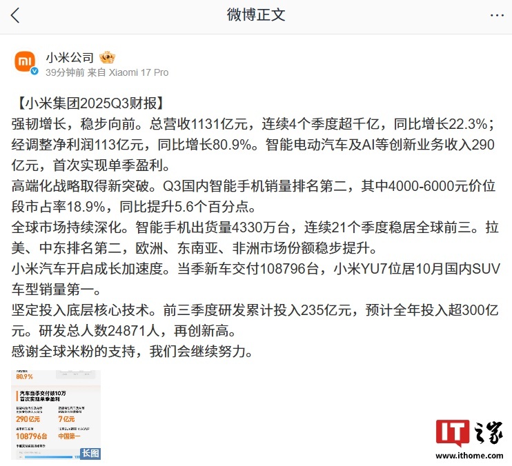 IT之家 11 月 18 日消息,小米公司官方今日发布了小米集团 2025Q3 财报。