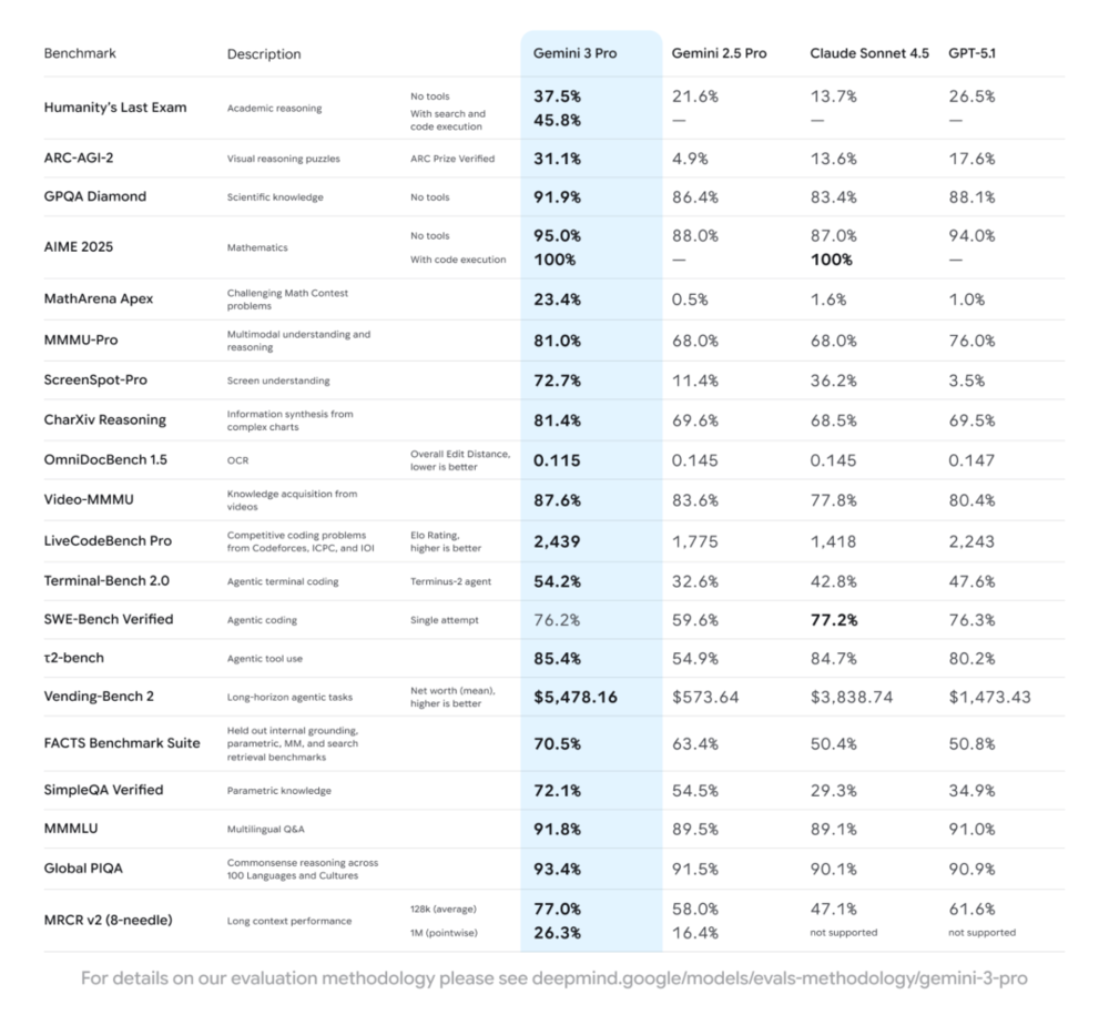 Gemini 3在一系列关键AI基准测试中达到了最先进水平。来源:谷歌开发者公众号