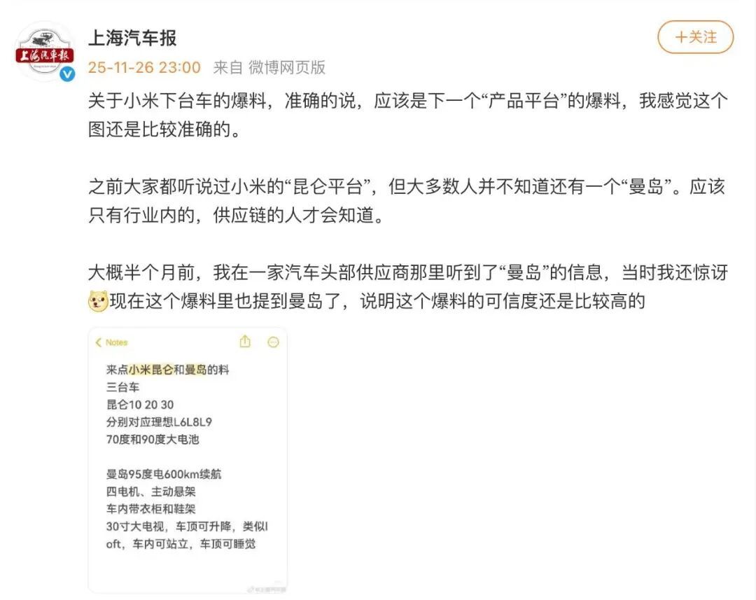 乍一看似乎真实性存疑,但随后微博有一位认证名称为 @ 上海汽车报的博主转发了此消息,并称:「大概半个月前,我在一家汽车头部供应商那里听到了「曼岛」的信息,当时我还惊讶。现在这个爆料里也提到曼岛了,说明这个爆料的可信度还是比较高的。」