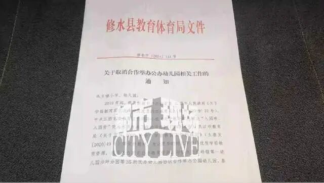 本以为能安稳合作下去,可2024年7月,修水县教育体育局突然下发通知,以“政策不允许合作办园”为由,单方面终止了与包括这两家在内的35所幼儿园的合作关系,称要杜绝“协议公办”“公办民营”等办园形式,依据是九江市相关专项治理方案。