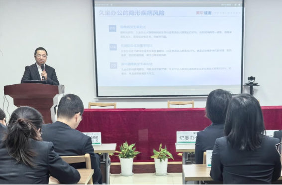 在职场健康隐患方面,费老师结合职场人常见的工作状态和生活习惯,如长时间久坐、高强度工作压力、不规律作息等,详细剖析了这些因素可能引发的各类健康问题,如颈椎腰椎疾病、视力下降、心血管疾病等,让员工们对自身潜在的健康风险有了更为清晰的认识。