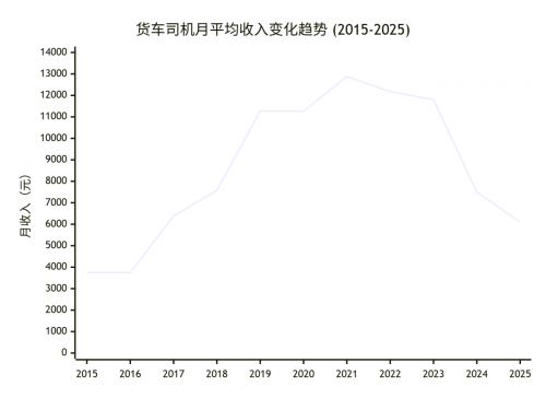 持续回落期(2022-2025年):收入在达到顶点后调头向下,连续四年下滑。数据显示,2022年货车司机的平均收入回落至约12000元,2023年进一步降至约11400元,而2024年收入跌破万元,约为9500元。到了2025年,收入进一步下滑至7000-7500元区间,这一趋势与2017年前后的水平基本持平。