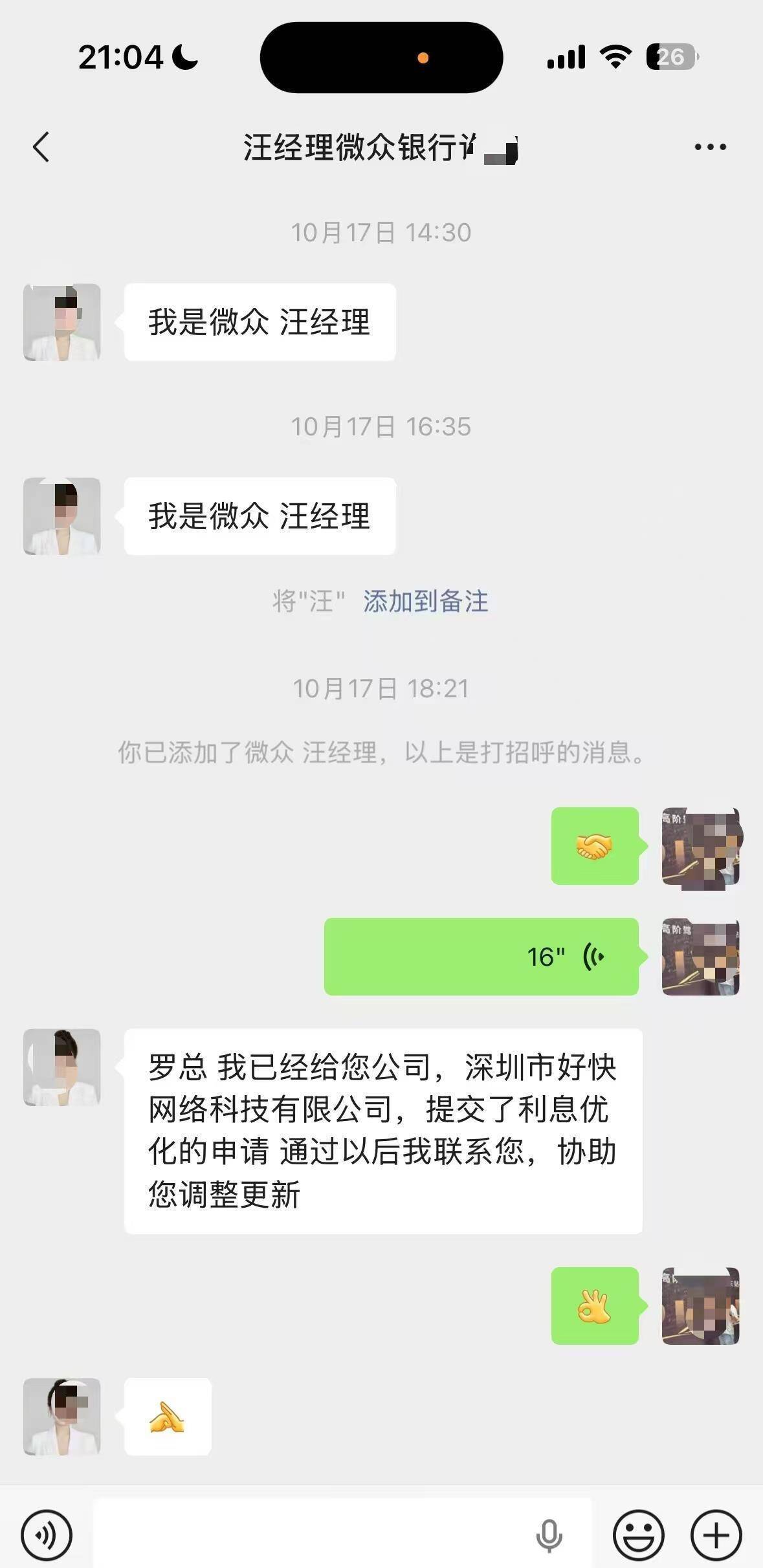 罗先生是广东深圳一家公司的负责人。今年10月16日,因资金周转需要,他通过微众银行APP企业版申请了一笔12万元的微业贷,年化利率为8.6%,由LPR+5.6%组成。申请提交不到一小时,他便接到一位自称“微众银行汪经理”的来电。对方准确报出了他的贷款金额、企业信息及联系方式,声称可为其申请“利息优化”,免去其借款年利率中的LPR。第二天,汪经理主动添加了罗先生的微信。