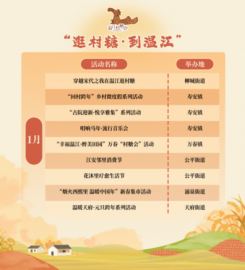 据了解,1月1日-3日,“穿越宋代之我在温江逛春糖”“温江村糖会暨万春首届年货大集”等2026年温江村糖会首轮活动将于温江文庙、温江幸福田园等地火热开启,以温江美酒、温江美食、温江好物及多种沉浸式玩法,为市民游客带来红火喜庆的跨年启新之约!