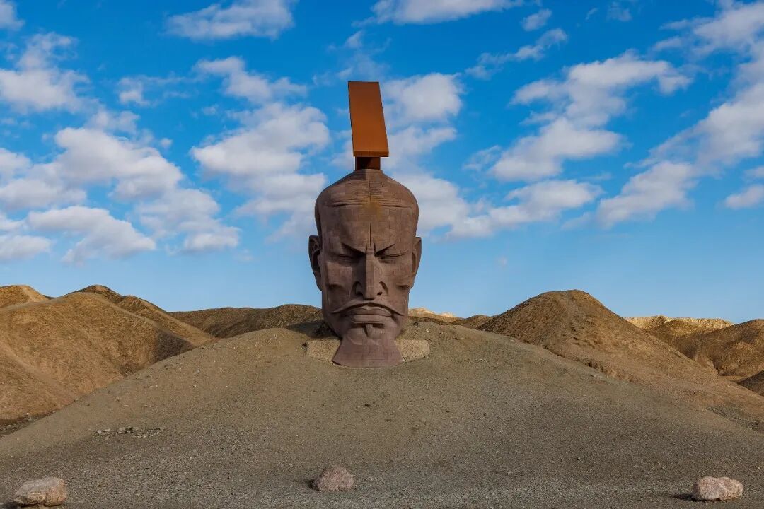 据悉,《汉武雄风》是董书兵发起的“荒野艺术计划”作品一部分。该雕像高约15米,仅头部露出地面,身体部分隐于沙土,神情凝重,被部分网友称为“活埋汉武帝”,进而引发对其创作意图的猜测。
