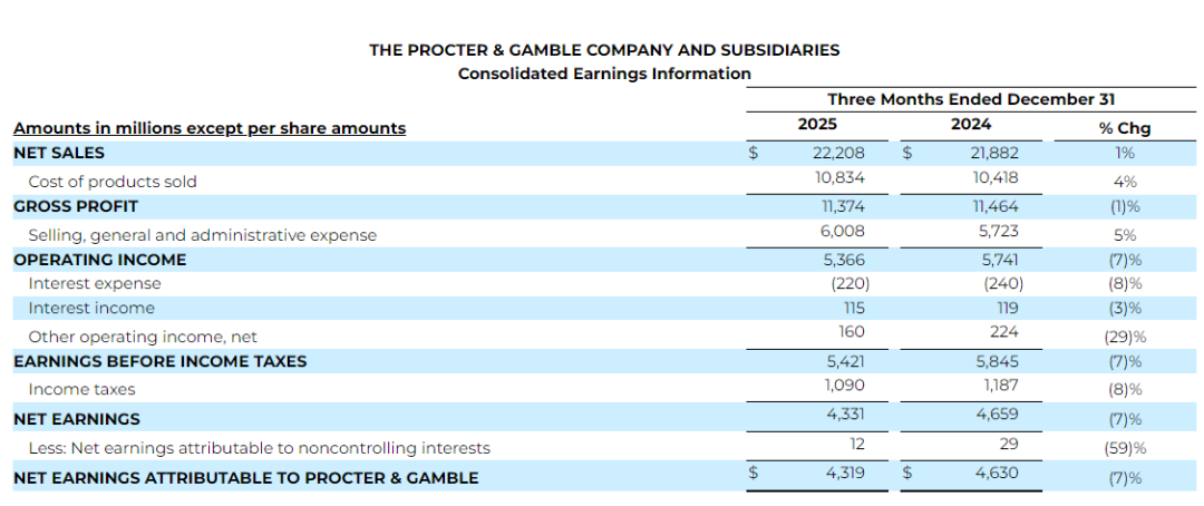 而从财报内容来看,宝洁2026财年Q2业绩呈现以下亮点: