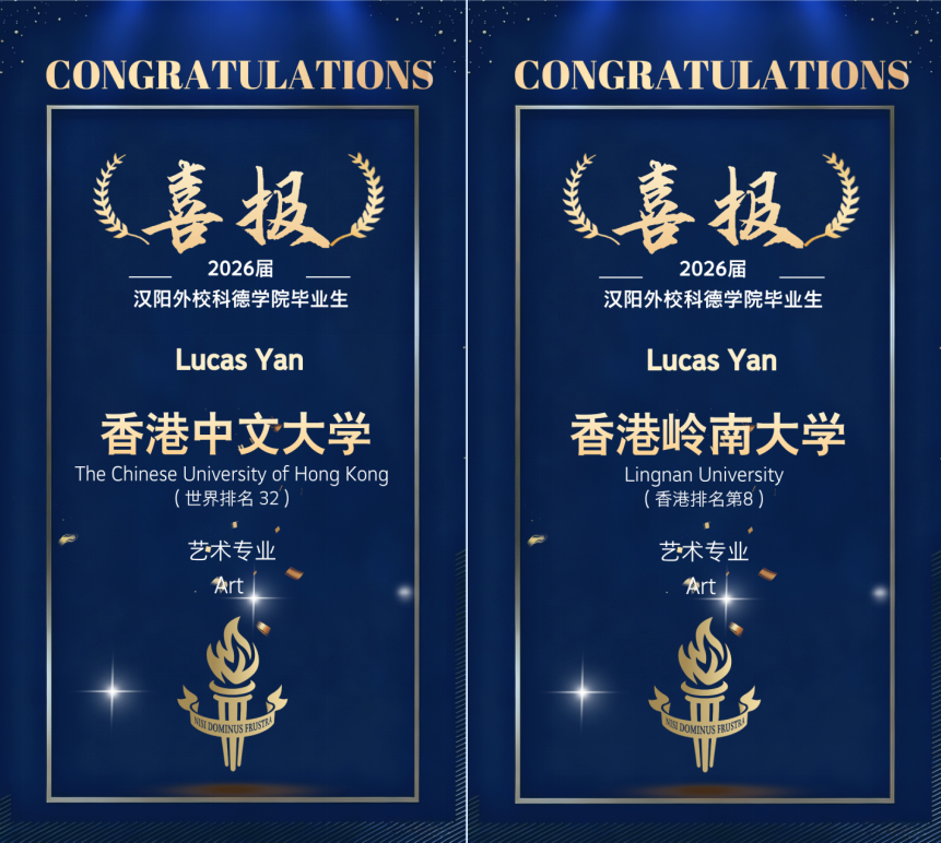 • Lucas Yan 一人包揽三校 Offer:世界排名 11 的香港大学建筑设计专业、世界排名 32 的香港中文大学艺术专业,以及香港排名 8 的香港岭南大学艺术专业,跨校跨专业表现彰显国际课程培养的综合素养;