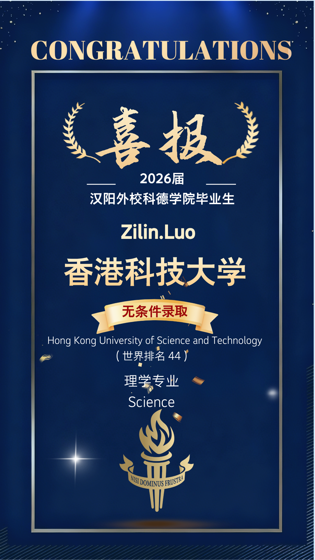 • Zilin.Luo 拿下重磅惊喜:世界排名 44 的香港科技大学理学专业无条件录取!港校 “无条件录取” 无需后续成绩附加,是稀缺的 “直接锁位” 资格,印证了学生在国际课程体系中的扎实功底;