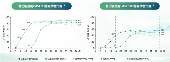 这些创新设计的实际成效,在Ⅲ期临床试验中得到了充分验证。CLEAR-1研究中,匹康奇拜单抗展现出令人鼓舞的结果,第16周PASI 90应答率达80.3%,sPGA 0/1应答率达93.5%,是目前唯一在注册研究中PASI 90突破80%的IL-23p19抑制剂。受试者在第52周时的PASI 90应答率继续升高至84.9%,且超过50%的患者实现了PASI 100,即皮损完全清除。进一步证实了匹康奇拜单抗的强效和持久。