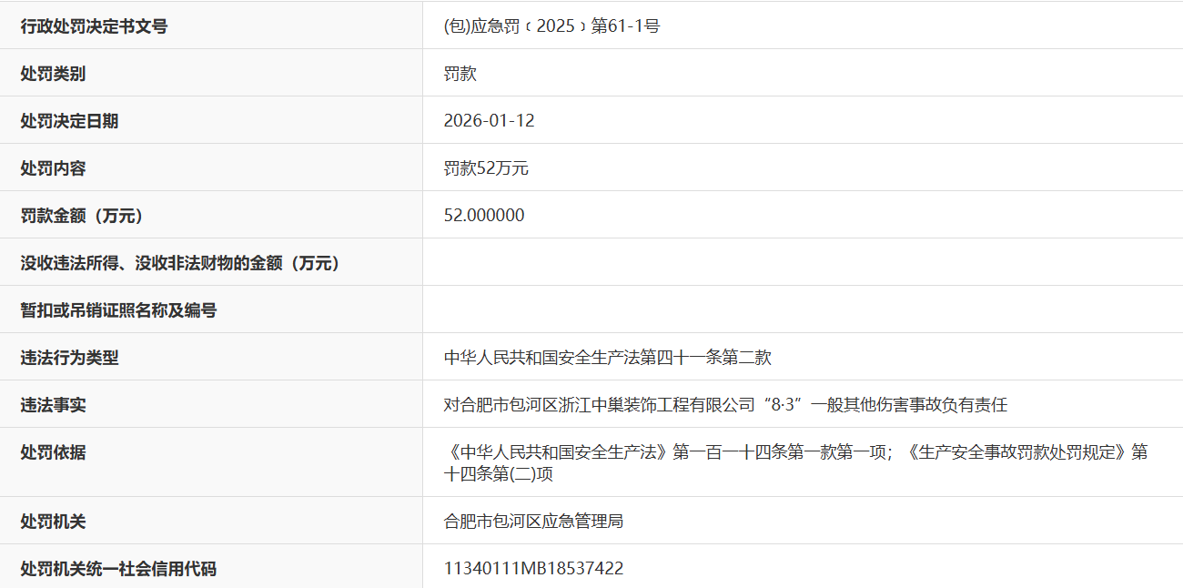 近日,据“信用安徽”公开披露行政处罚信息,因对合肥市包河区浙江中巢装饰工程有限公司“8·3”一般其他伤害事故负有责任,安徽省儒徽建设工程有限公司被处以罚款52万元。行政处罚决定书文号是(包)应急罚﹝2025﹞第61-1号。