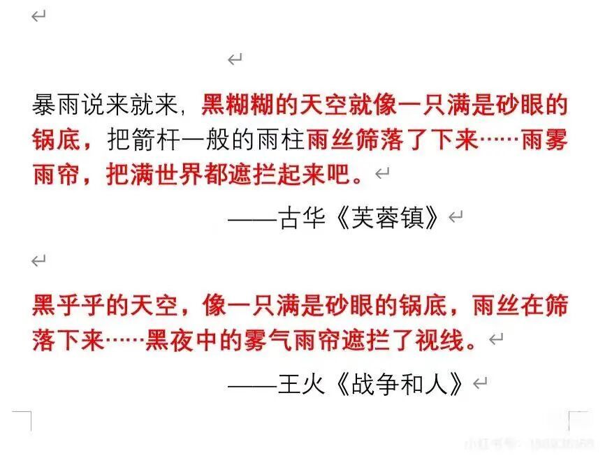 古华写暴雨前“黑糊糊的天空就像一只满是砂眼的锅底”,王火抄过来,把“糊糊”改成“乎乎”。