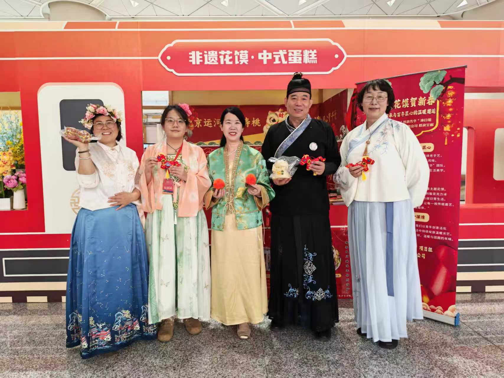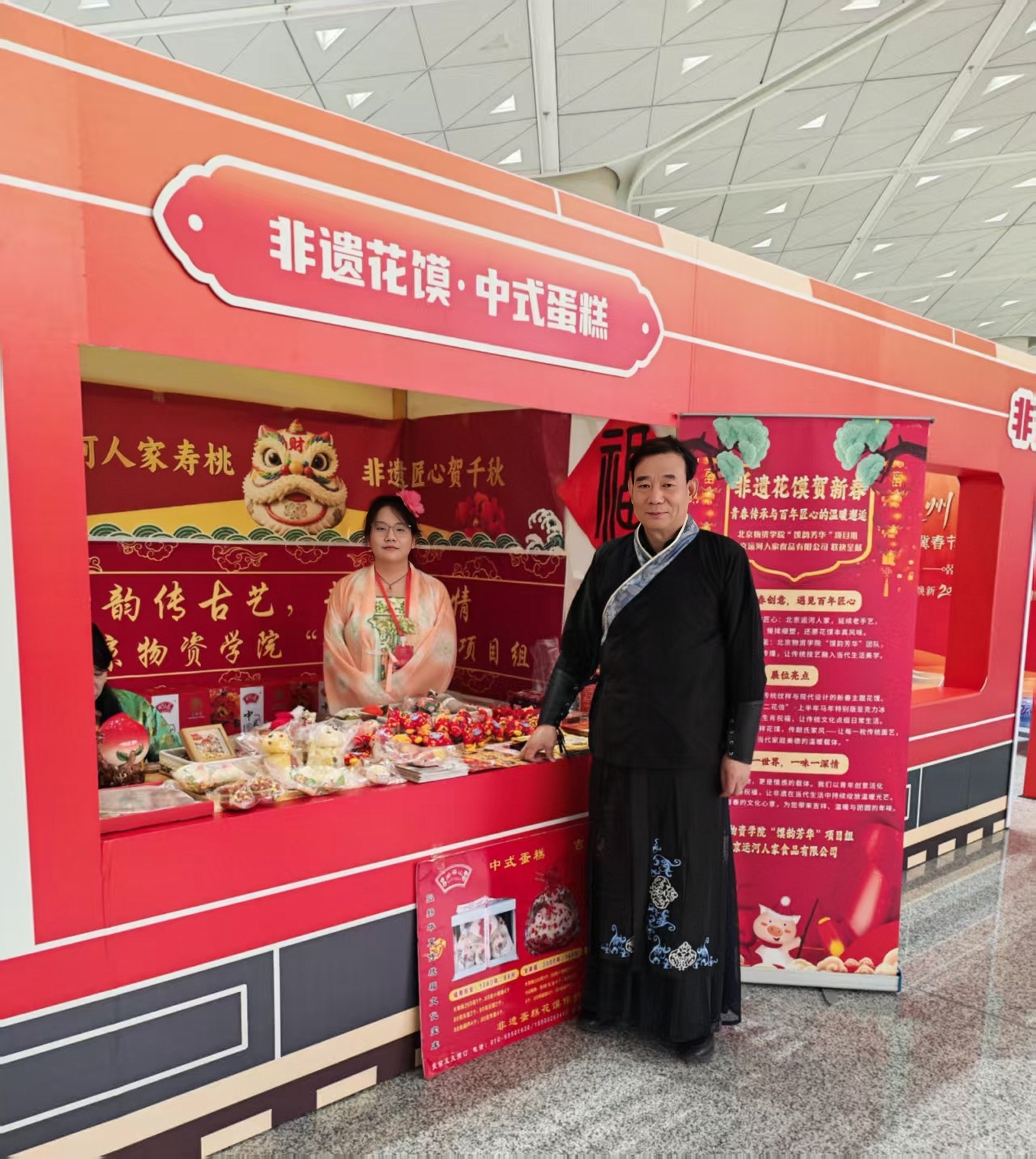 展位上,几位身着汉服的身影格外引人注目。北京物资学院经济学院朱群芳教授、北京运河人家食品有限公司董事长张继军、颜氏汉服文化传承人颜丽君老师、通州区非遗花馍第四代传承人张鑫莹老师以及项目组负责人唐逸恩同着汉服,衣袂翩然,共立传承。张继军亲自驻守展位,向每一位驻足的游客讲述花馍的吉祥寓意,解读传统技艺的匠心所在。
