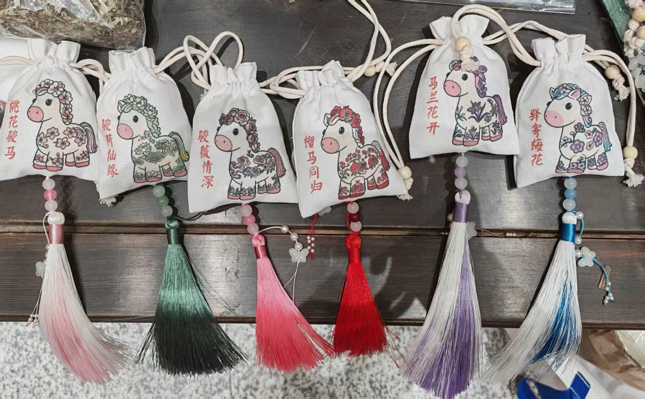 趁热打铁。2月13日,项目组在集市现场同步上新产品——“骥驰四季·十二花信”系列非遗香囊。香囊由传统布料手工缝制、采取印花工艺,内填艾草、广藿香等6种天然香料,纹样设计延续了花馍文创的吉祥元素。这也是项目组“非遗生活化”产品矩阵的新尝试:从餐桌上的花馍,到冰箱门上的亚克力,再到随身佩戴的香囊——非遗不再是被束之高阁的老手艺,而是可食、可观、可佩、可伴的生活陪伴。