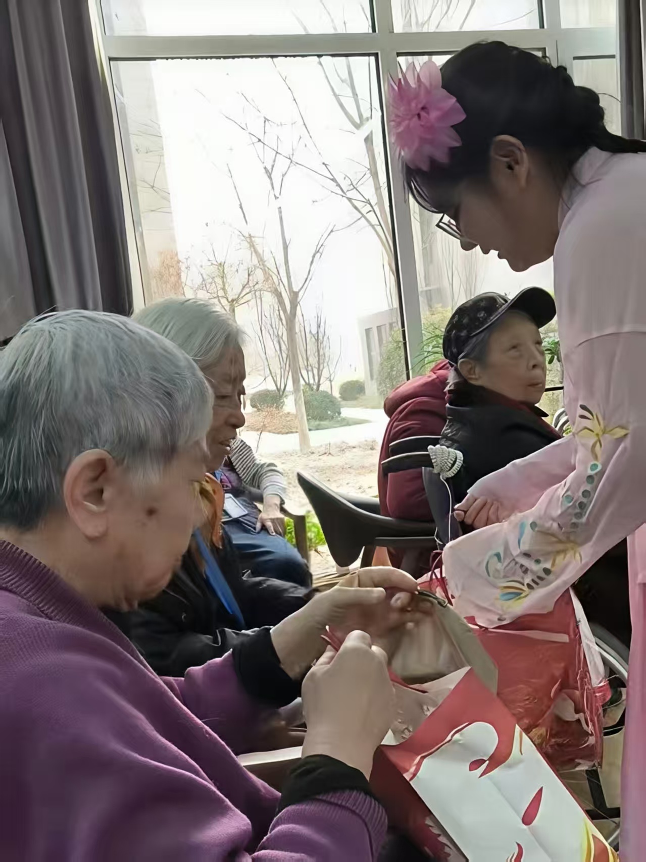 在春节集市正式开启之前,项目组已经完成了一次意义非凡的“预热”。1月下旬,“馍韵芳华”项目组走进汇禧润福艺术家养老公寓,为长者们带去了一场别开生面的非遗慰问活动。同学们身着汉服,手捧由运河人家精心制作的花馍,将这项指尖上的非遗技艺与《颜氏家训》中“孝亲敬长”“睦亲齐家”的经典训诫相结合。在赠送花馍的过程中,他们不仅讲述着花馍背后“五谷丰登、祈福纳祥”的美好寓意,更将孝亲敬老的传统美德化作可触可感的温暖。