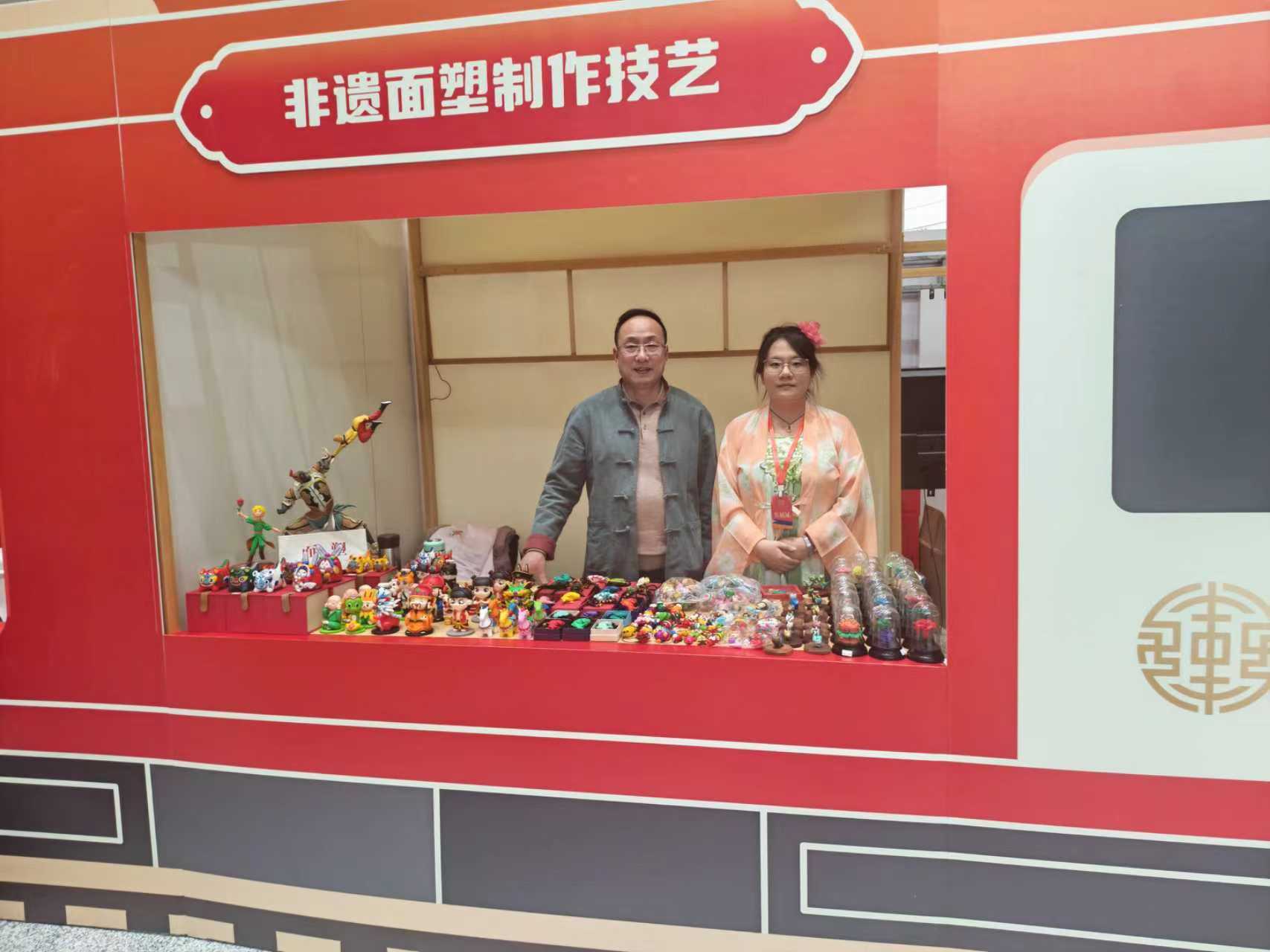 活动期间,“馍韵芳华”项目组有幸与面塑非遗传承人王学文老师展开了深度交流。王老师年逾六旬,一双巧手却能在一刻钟内将普通面团塑成栩栩如生的神话人物。看到花馍文创展位,他驻足良久,并与同学们探讨起“面”在不同非遗门类中的可能性。“面塑是‘捏人塑神’,花馍是‘寄情于形’,其实根子都是对面性的理解。”他的一席话让项目组成员深受启发——技艺虽各有门道,但对面的敬畏、对手工的虔诚,是所有面类非遗共通的灵魂。