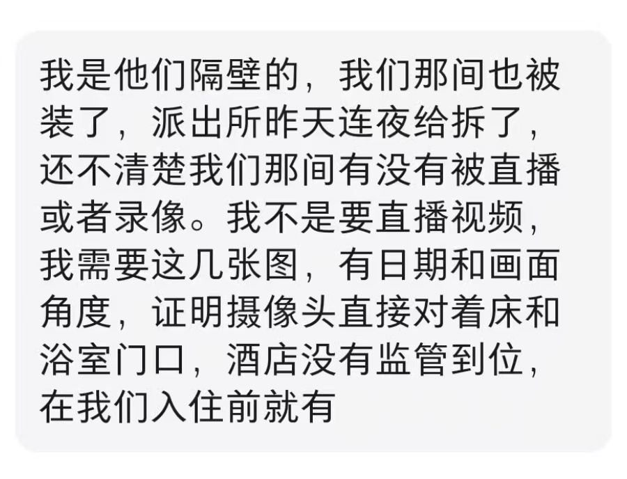 对于目前已开展的工作,该民警表示,18日技术部门已到现场排查,具体已排查出的针孔摄像头数量不方便透露,但现场报警的入住人房间摄像头已拆除。