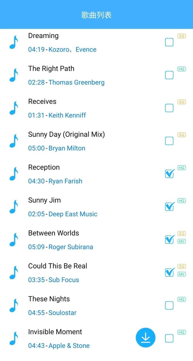 想要批量下载的话,长按歌曲即可多选歌曲,默认以最高音质下载,再次长按则是取消多选。